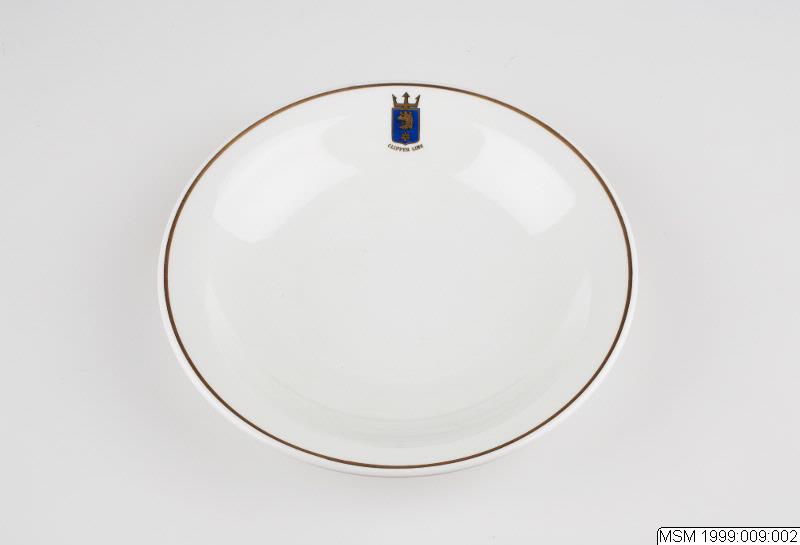- Djup tallrik tillhörande matservis från kryssningsfartyget STELLA POLARIS, tillhörande rederiet Clipper-Line, Malmö. 1950-talet. Vit benporslin från Rörstrand, Sverige. Med guldkant och Clipper-Lines emblem på brämet. Servisen beståra av :01 mattallrik; :02 djup tallrik; :03 assiett; :04 desserttallrik; :05 kaffekopp med fat; :06 askfat. Tillhörande arkivalier i föremålsarkivet. Vinlista i pärm, matsedlar, resekataloger (1960-tal), foton, vykort. Inlån till utställningen "Han kom över havet". Gåva efter Einar Hansens död 1994.