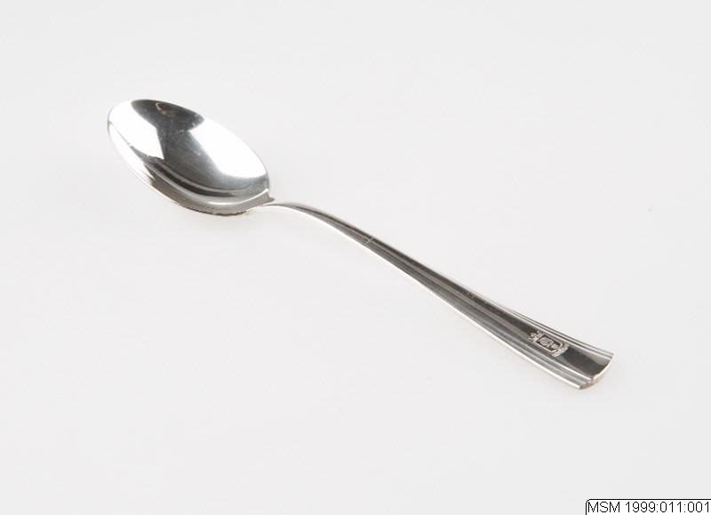 - Matsked med Clipper Lines logotyp. Tillhörande: Restaurangsilver, en uppsättning, av 45 g alpaccasilver med Clipper-Lines emblem ingraverat. Fabrikat Gense. Från kryssningsfartyget STELLA POLARIS. Inlån till utställningen "Han kom över havet". Gåva efter Einar Hansens död 1994. Tillhörande arkivalier (vinlista i pärm, tomma matsedlar, vykort, resekataloger från 1960-talet) finns i föremålsarkivet.