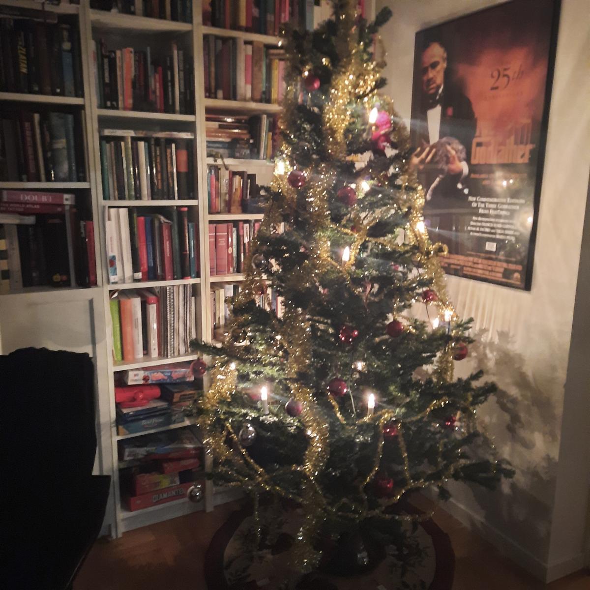 "Köpt av exmaken som köpte 2 för några år sedan. Pyntet är från svärmor, från min mans tidigare hem och från mitt eget. Några är presenter från julmarknader andragjorda på dagis och i slöjden."