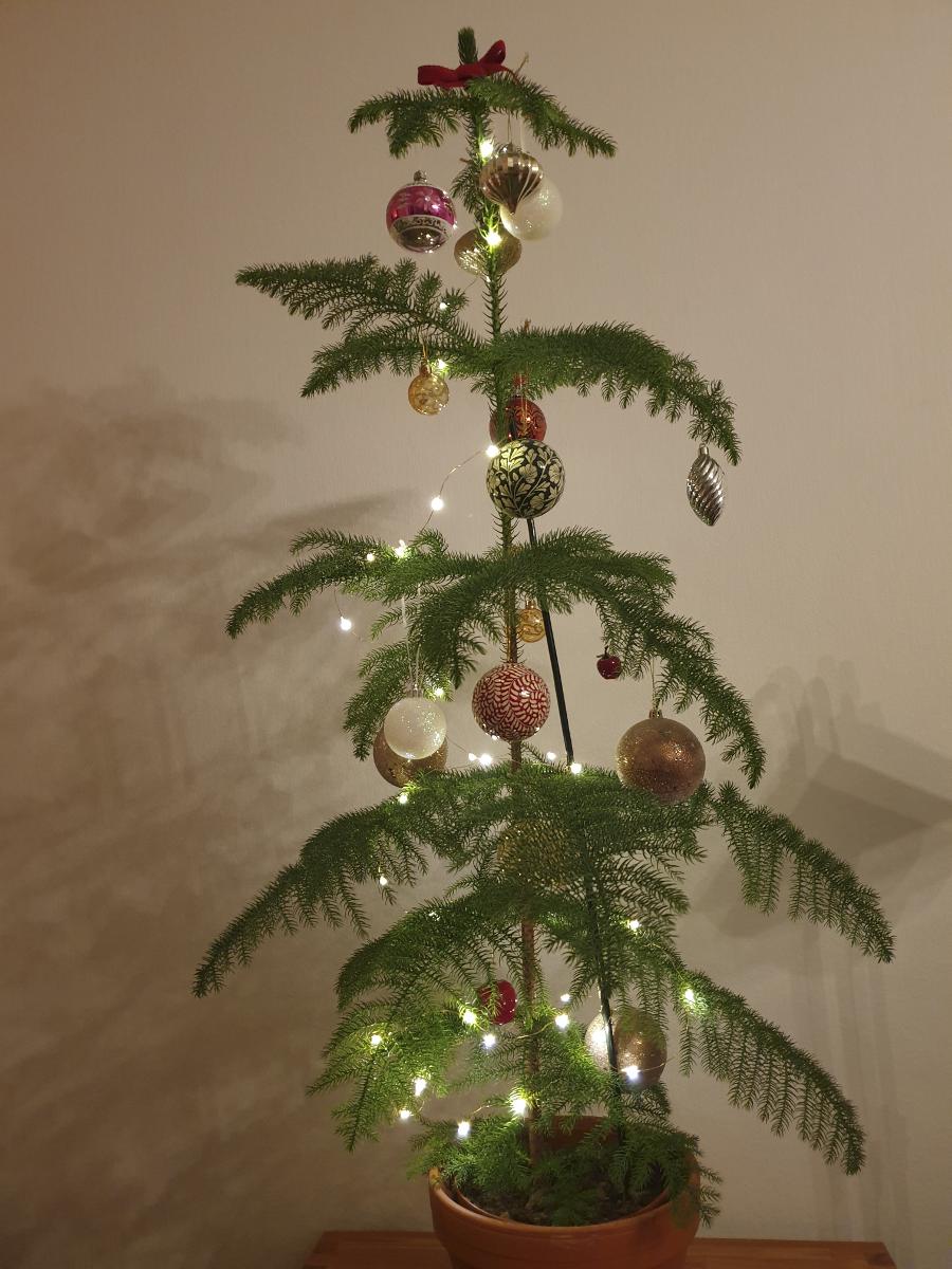 "Då jag har katt går en vanlig gran bort så jag valde istället att köpa en rumsgran (Arucaria heterophylla) på Plantagen i Svågertorp. Min sambo och jag köpte sedan några billiga kulor på Stadsmissionen, roligt att fynda saker tillsammans som vi kan ha många år framöver! Vi människor, katter och granen bor i Augustenborg i Malmö."