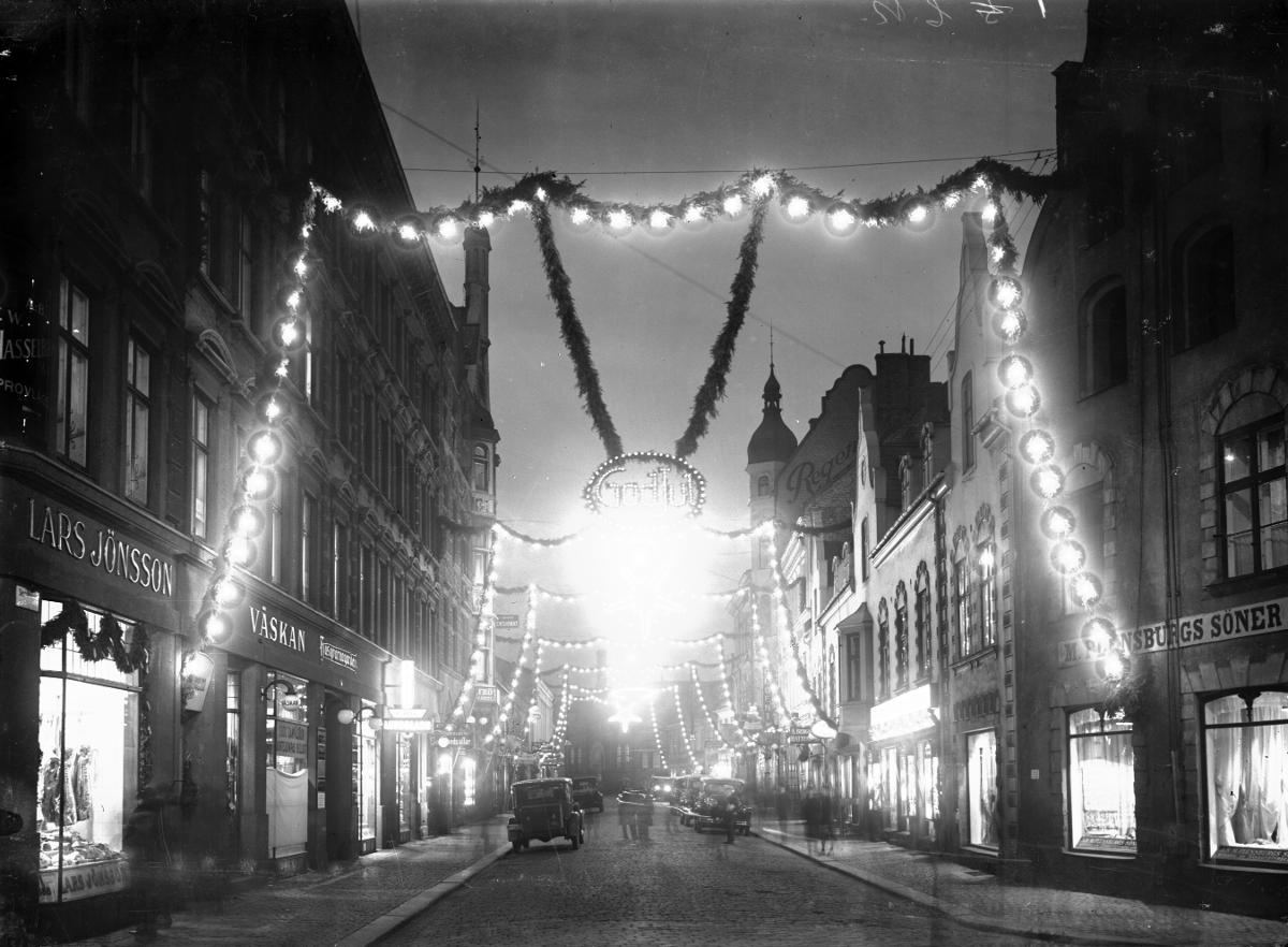 Miljöbild av Södergatan i juletid. Flensburgska huset syns till höger i bild.