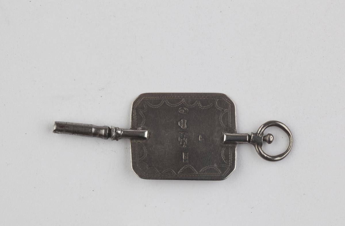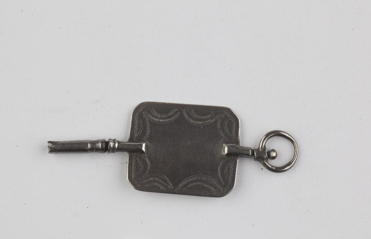 Urnyckel, av silver. Rektangulär skylt med avklippta hörn och graverad dekor, rör av stål.