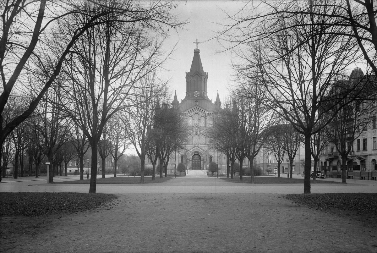 Bild från serien: "Möllevångenskyrkor. Blandat. Caroli kyrka, interiör. St. Pauli kyrka. Västra Skrävlinge. Västra Klagstorp; i ring kring altarrunda altartavla."