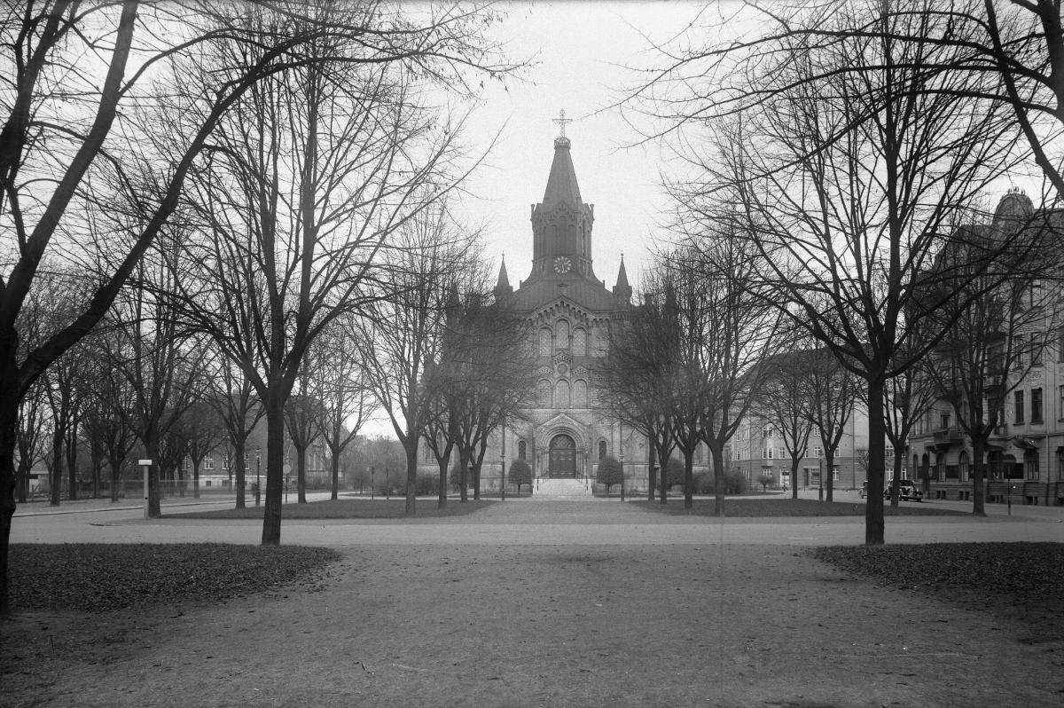 Bild från serien: "Möllevångenskyrkor. Blandat. Caroli kyrka, interiör. St. Pauli kyrka. Västra Skrävlinge. Västra Klagstorp; i ring kring altarrunda altartavla."