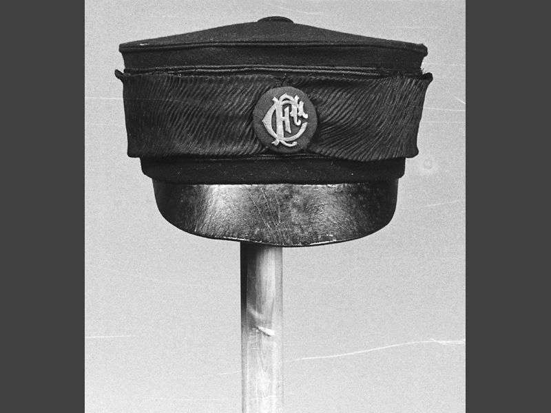 - Chaufförsmössa av mörkblått kläde med svart soutachenoddar. Skärm av svart skinn, fodrad med svart satin. Kokard av mellanblått kläde med initialerna CF [Cornelius Faxe] av gulmetall. Krusflorband runt kullen.