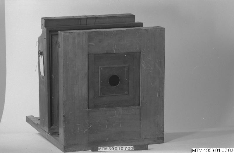 - Fotografikamera. Extra stor träkamera 500x560 mm med 770 mm lång bottenplatta av polerat trä, något skadad av mask. Visirskivan är 380x380 mm. 1 träkasett medföljer. Optiken ej påmonterad men passar i skruvhålen. Enkel 44 mm lins med irisbländare.