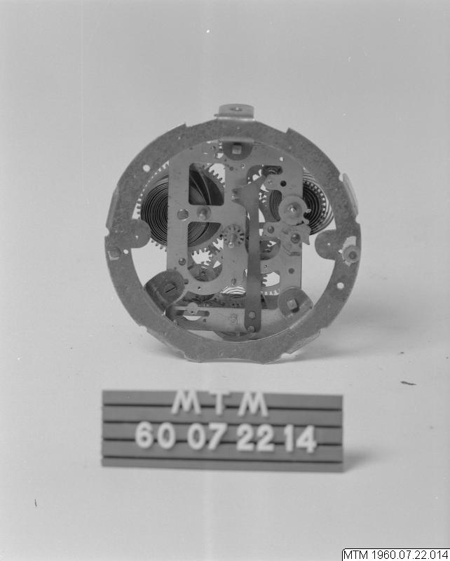Urverk. Till väckarklocka med ringverk, oro och fjäderdrift.