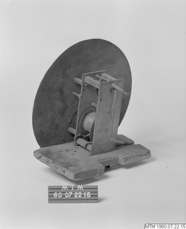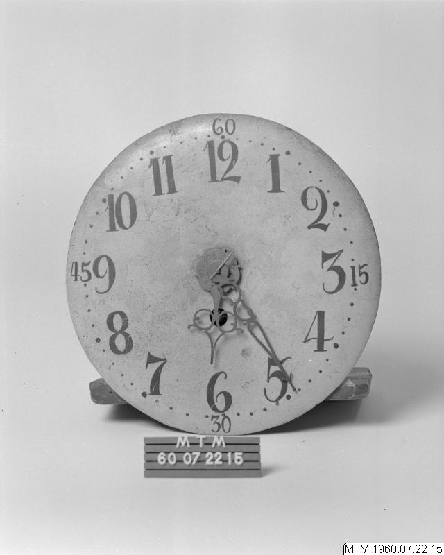 Urverk. Till ståndur. Pendelur med släphaksgång, loddrift, ej utrustad med slagverk. Målad gråvit urtavla med svarta arabiska siffror samt minut och timvisare av mässing. Lod saknas.