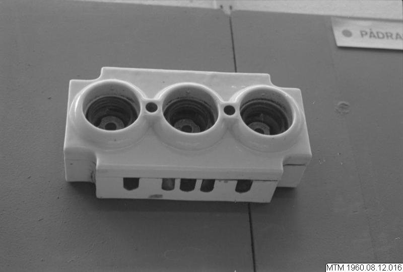 Säkringshållare för 3 proppar. 10 A. 500-750 V. Propparna saknas. Från katalogkort: " Placering: 790913 entrén vid hissen".
