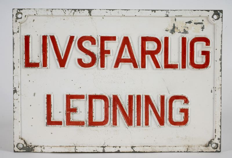 Skylt. Av emaljerad gjutjärn. Vit med röd text: "Livsfarlig Ledning".