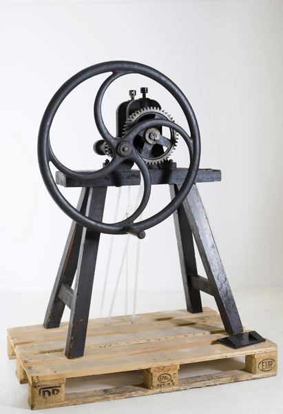 Plansvals, av stål och gjutgods på trästativ, driven med handvev.
