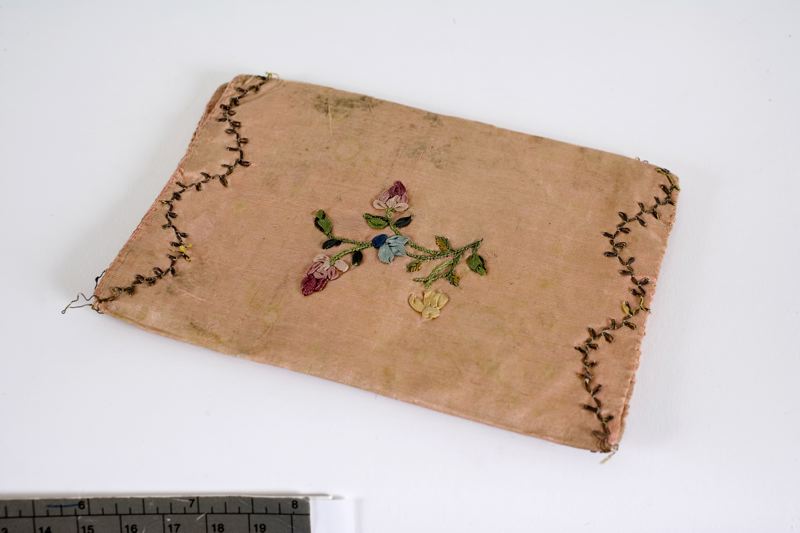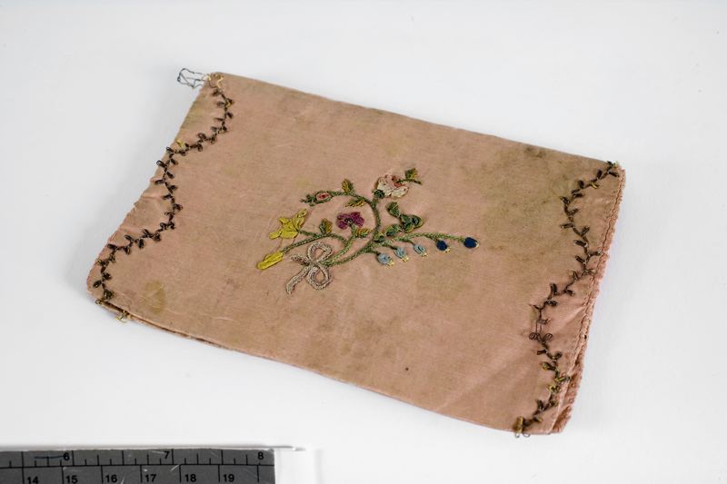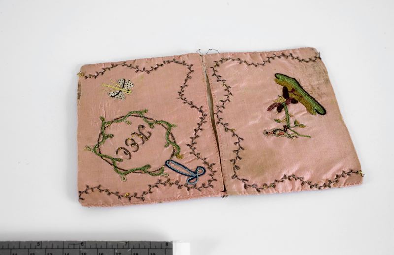- Sedelbok av rosafärgad siden med broderad dekor i tambursöm av silke och sidenband i flera färger samt påläggssöm av metalltråd. Foder av vitt siden, söndrigt. Utsidan har broderade blombuketter och insidan har en fågel i ett träd samt en krans med monogramet K.E.C och en liten fjäril