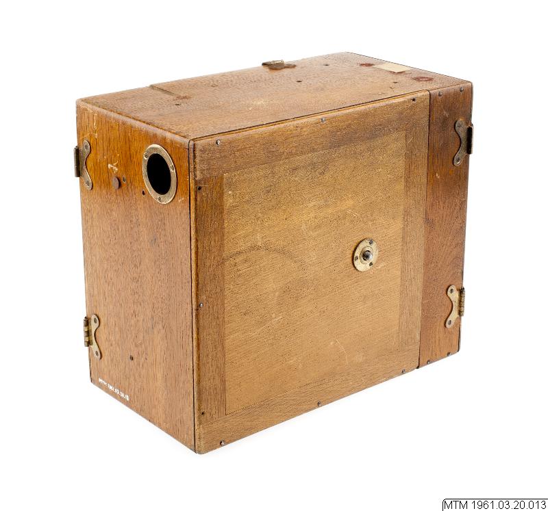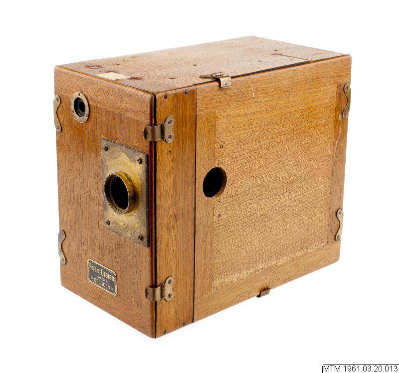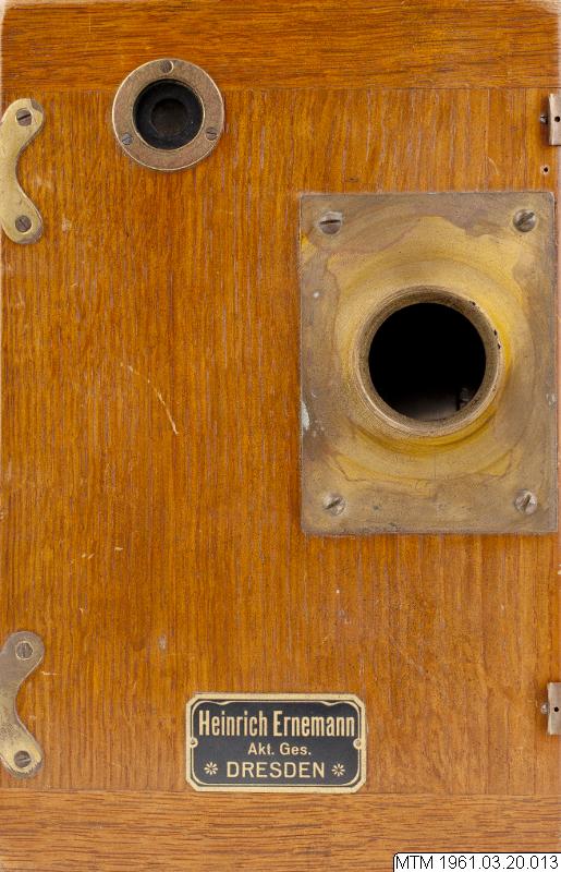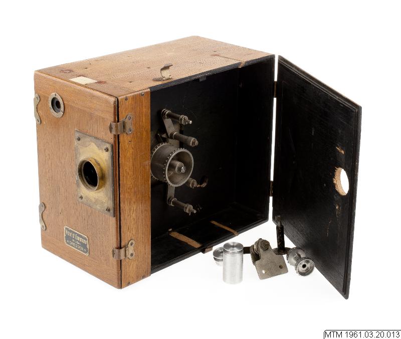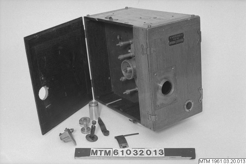 Filmkamera av ek för normalfilm. Fabrikat Heinrich Ernemann AG. Objektiv saknas. Lösa delar. Pappersetikett märkt med nr 13.