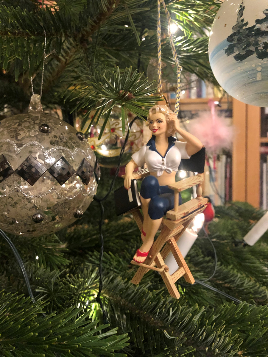 "I vår familj storsatsar vi på julgranen varje år. Granen ska nå upp till taket, och vi har tre meter i takhöjd. Målet är att alla grenar ska vara klädda, men det går i princip inte att fylla en gran helt har vi upptäckt. Årets gran (2022) har vi köpt på St Knuts torg. En ambition är att allt pynt ska vara unikt, alltså bara en av samma, inga dubletter. En hel del av det som hänger i granen har vi eller vänner köpt på resor. På fotona syns bland annat Marilyn Monroe i en regissörsstol, inköpt i Kanada. En flaska Maker’s Mark bourbon, inköpt i Kentucky. Hermiones balklänning från Harry Potter-fïlmerna, inköpt på Harry Potter-filmstudion utanför London. Ett sammetsägg i viktoriansk stil, inköpt på en antikaffär i en by i södra England."