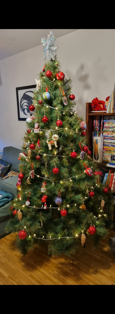"Klädd och prydd gran. Granen är köpt på Claes Ohlssons. Vi har en bas av röda julgranskulor och halmpynt. Sedan kompletterar vi med olika julpynt vi plockar upp. Detta året var det astrohunden Lajka som fick pryda granen."