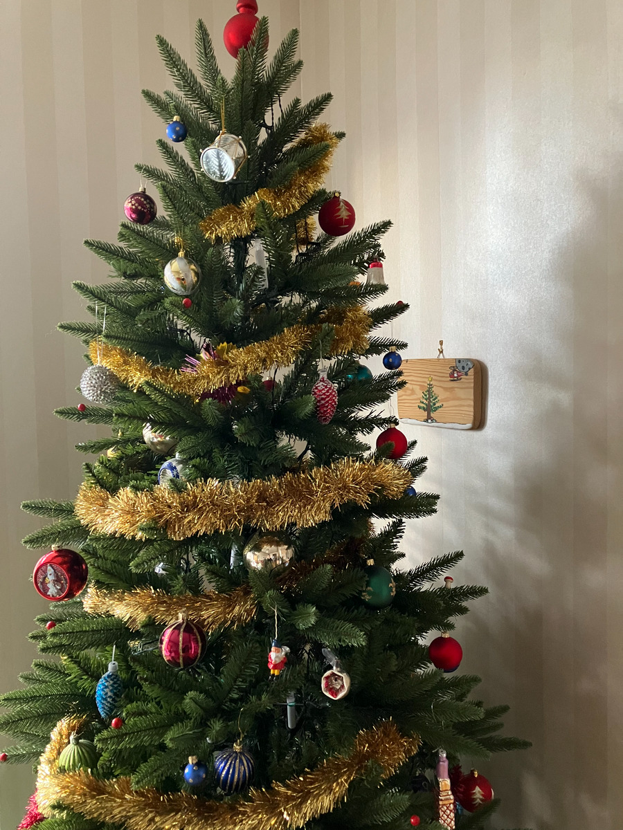 "Sedan barnen föddes har vi haft julgran varje år. Utan julgran, ingen riktig julstämning. Vi har haft alla varianter, stora som små. Skeva och glesa. Sådana som barrat direkt när de kommit innanför dörren och riktiga praktexemplar. De senaste åren har vi dock gått över till att ha plastgran. En anledning till att vi börjat med det, är att vi vid ett tillfälle köpte en kungsgran som hade så kraftig lukt och droppade kåda, att en av oss fick svårt att andas. En annan anledning är att det ibland varit svårt att få tag i en riktig gran. De har tagit slut, eller så har de bara funnits till salu så långt ifrån vår bostad att vi helt enkelt inte orkat släpa hem en. Vi har ingen bil. Vi har två olika plastgranar. En är av mindre modell med ett riktigt naturtroget utseende. Den brukar vi använda som vår ”andragran”, i något av de mindre rummen i vår bostad. I år (2022) använde vi bara den större granen som vi köpte i en inredningsbutik på Mobilia runt 2019. Den är 230 cm hög och ser tyvärr inte särskilt naturtrogen ut i formen. Mer som en strut. Vår lägenhet, som vi precis flyttat in i, har en fin plats i vardagsrummet att ställa julgranen på. Den får stå i centrum, men ändå skyddad av ett hörn. Vår gran börjar alltid sin julresa hos oss genom att vi klär den med belysning. Vi njuter av att den får stå och tindra ikapp med julstjärnorna i våra fönster under minst en vecka före julafton. Vi klär gärna granen på lillejulafton. Det första som åker upp är dekorationen i granens topp. Vi har växlat mellan att ha en stjärna i toppen eller en spira. (Något år var granen vi köpte så underlig i toppen att vi själva fick paniktillverka en stjärna för att den skulle passa) I år blev det en röd spira. Sedan är det dags för det andra pyntet. Vi har kulor, klockor, svampar, kottar, tomtar och annat fint till granen som vi samlat på oss under årens lopp. Det mesta av pyntet är inköpt i Malmö med omnejd. På Åhléns, Ikea och på Vellingeblomman. Några extravaganta kulor är inköpta på Harrods i London, och på julmarknader i Tyskland och Polen. Den allra finaste kulan fick vi förra året. Den är röd och har en bild på vårt äldsta barnbarn. Vår svärdotter satte den i granen under julaftonskvällen utan att vi märkte det. Det blev en fin överraskning på juldagsmorgonen att hitta den nya kulan med ett porträtt på Henning! I år placerade vi kulor av glas högst upp i granen, och oömt pynt längst ner för våra barnbarns skull. Det är klart att de ska få känna på allt fint som dinglar i deras ta-höjd. Glittret sätter vi på allra sist. Det är ju det som fulländar granen! Vi älskar tjockt glitter, gärna i guld och rött. Det är något speciellt med att sätta på glittret, det blir ju som en dans runt granen. När granen är på plats brukar vi sätta oss i soffan och dricka ett glas mumma medan vi beundrar underverket. Vi brukar säga att den aldrig har varit vackrare än just i år."
