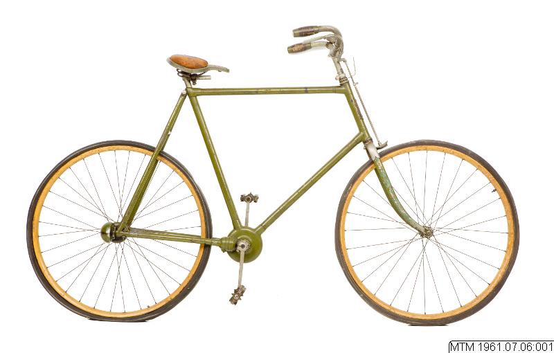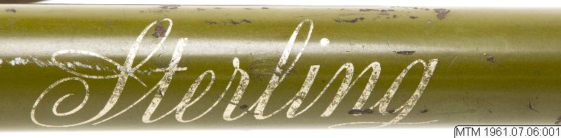 - Herrcykel av märket "Sterling", med kardanaxel. Framhjulsbroms från styrstången. Text på cykelmärket: The Sterling. Made in Chicago, USA. Patented Sept. 10, 1895, Jan. 12, 1897. Other patents pending. Built like a watch.