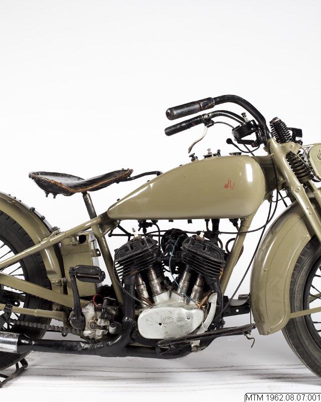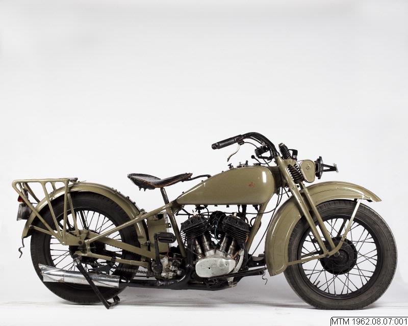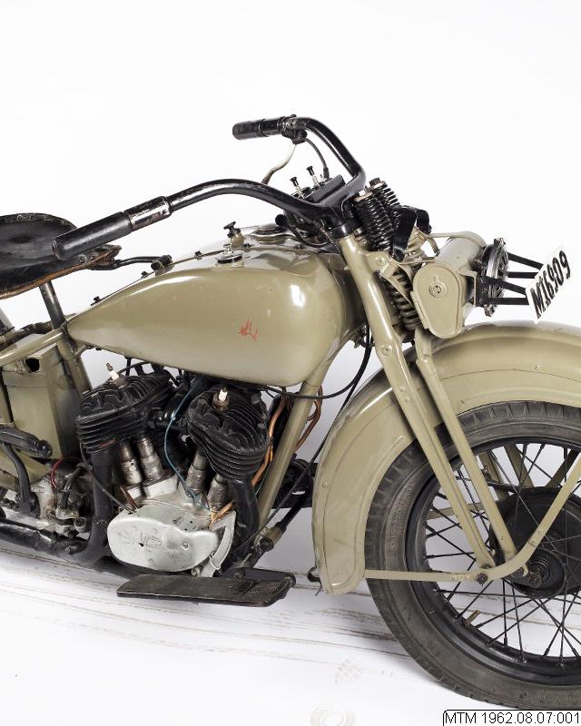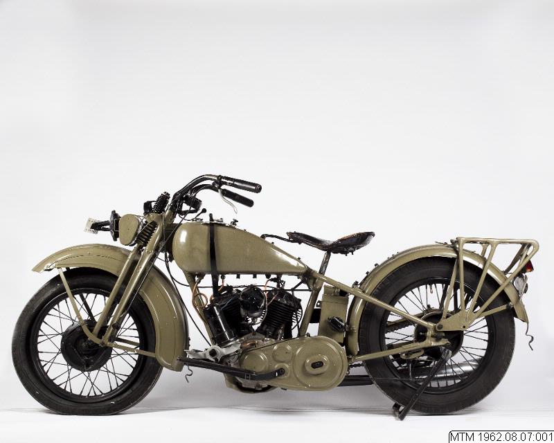 Motorcykel. Harley Davidson från 1933. Solomaskin. 2-cylindrig luftkyld sidventilsmotor, 12 hk. Växellåda: tre växlar framåt.Vikt: 180 kg.Maxfart: ca 100 km/tim.