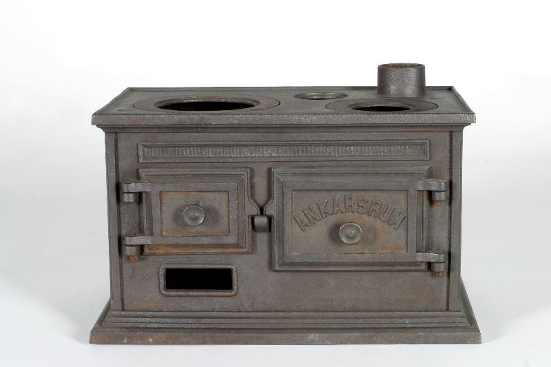 Vedspis av gjutjärn. Spis, leksaks-, järn, gjutet, medtexten "ANKARSRUM" framtill samt på sidorna. Tre kokhål. Flera spisringar saknas. Framsida med ugnslucka till höger och eldstads- och asklucka till vänster. Askluckan saknas.