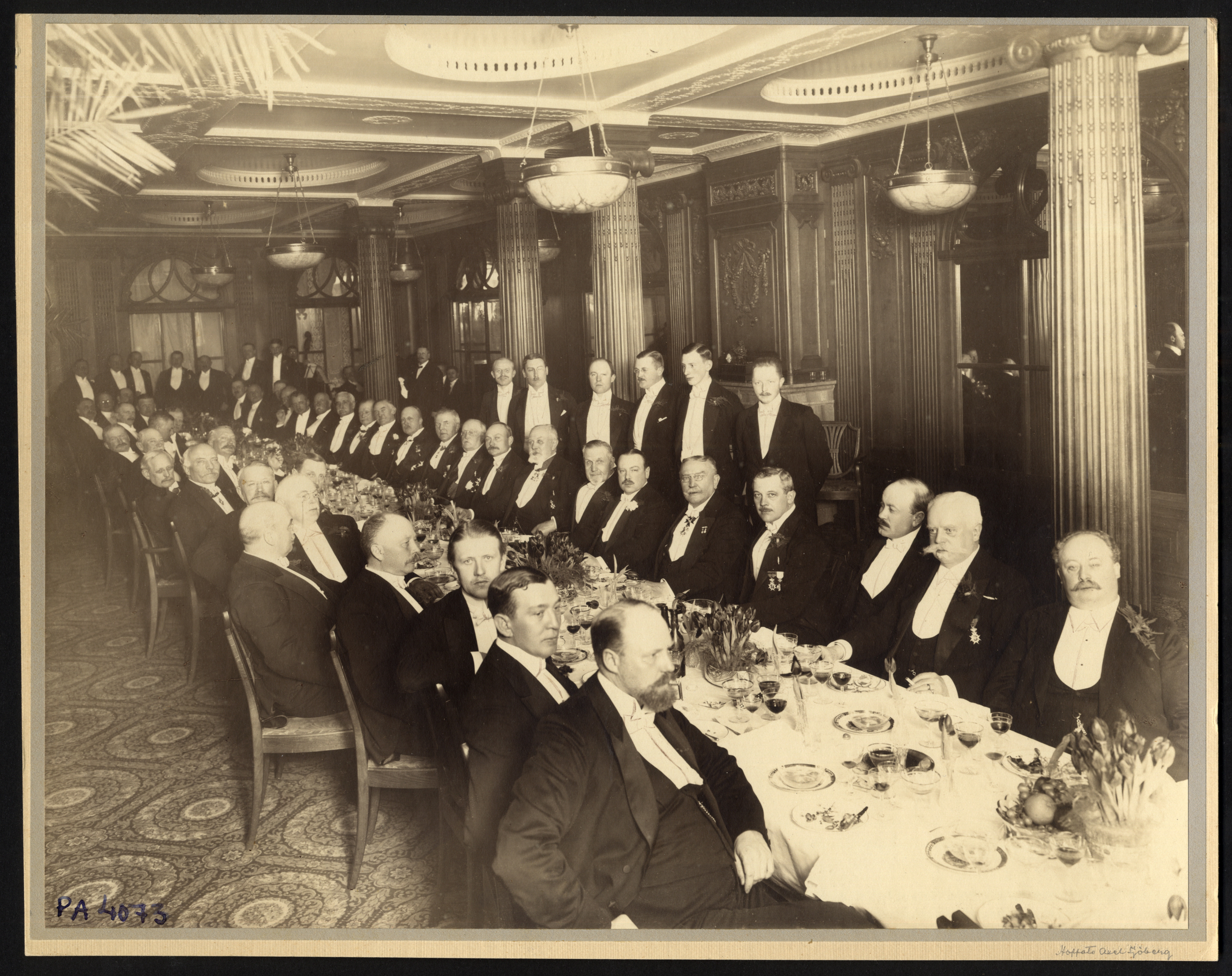 Inetriör, grupporträtt, av middagsgäster på Malmö Yllefabrik.