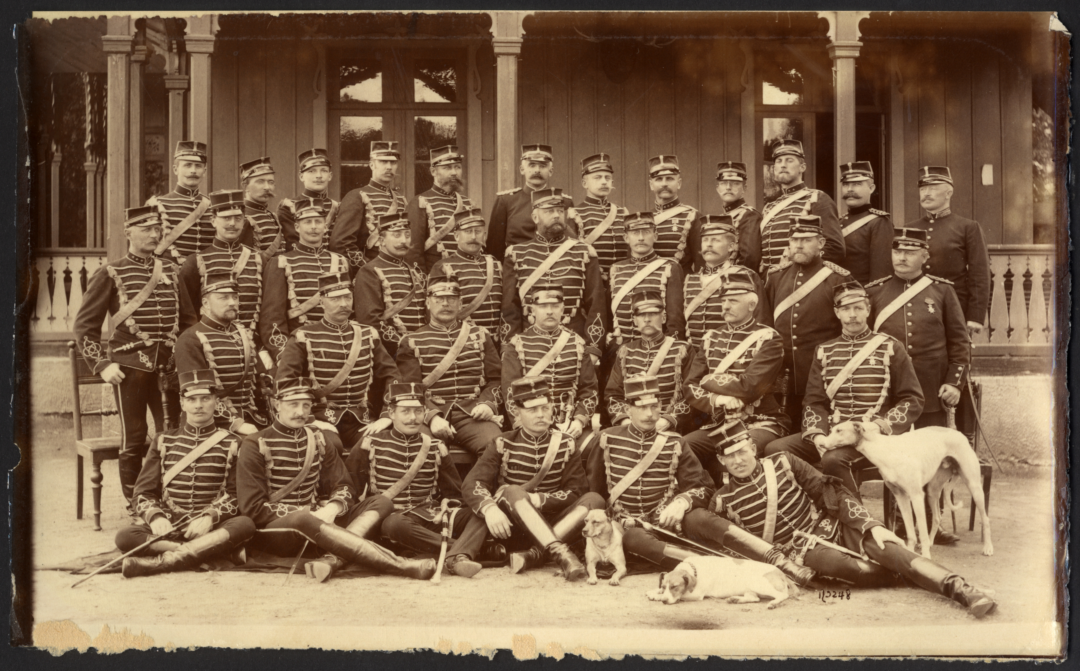Gruppbild. Kronprinsens Husarregemente med några av sina hundar.