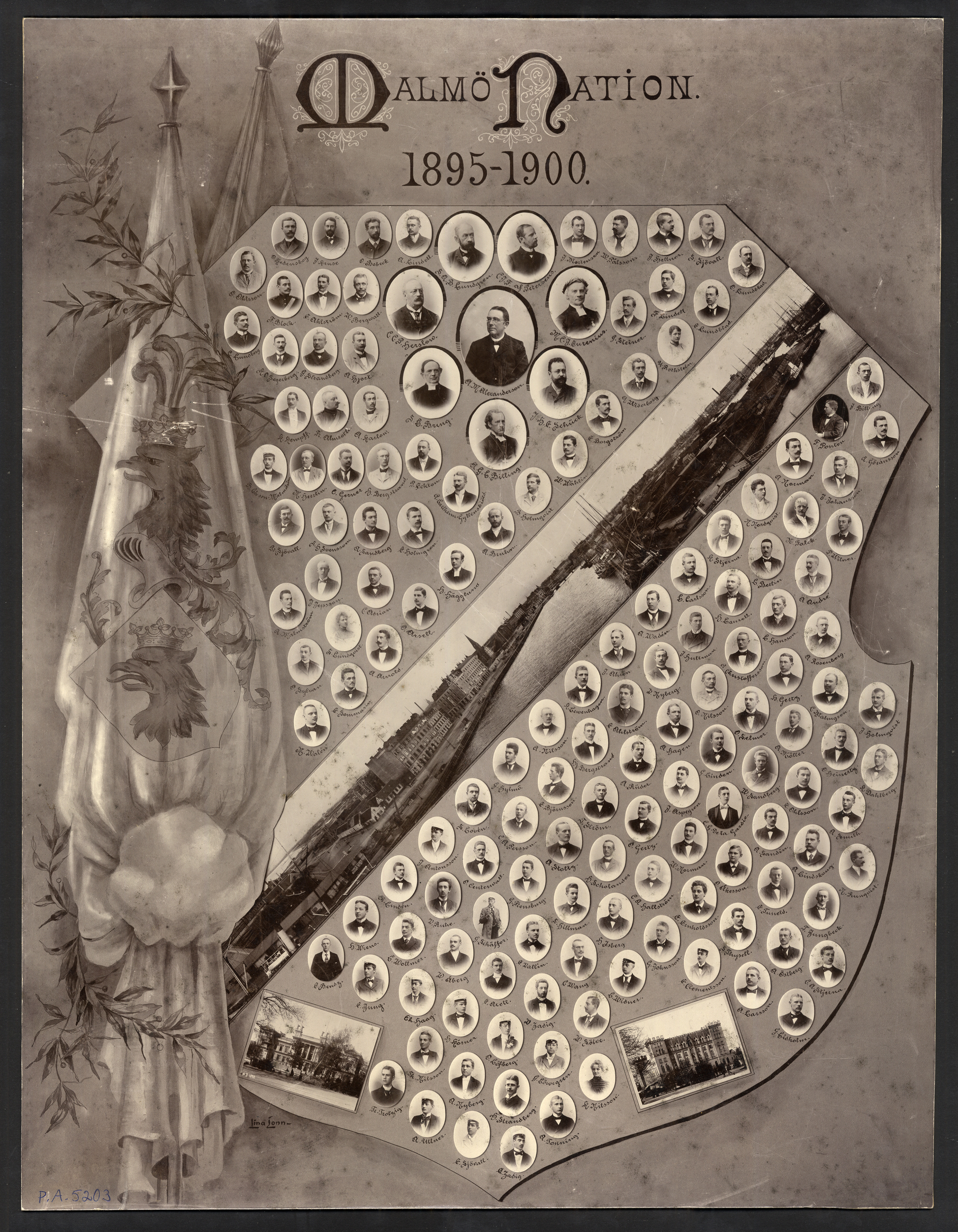 Malmö nation 1895-1900. Ca. 60 små porträtt samt tre bilder på byggnader, samlat på kollage. Se bild för namn.