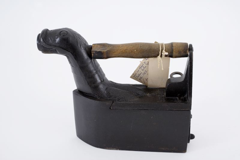 Strykjärn med skorsten i form av djurhuvud. Från en patient på Östra Sjukhuset. Patienten var avliden för länge sedan. Strykjärnent skulle kastas, fru Hagsten tog tillvara det, kan ej erinra sig namnet på patienten. Inga anförvanter har låtit sig avhöra för att göra anspråk på detta strykjärn. Märkt: Husqvarna 2.