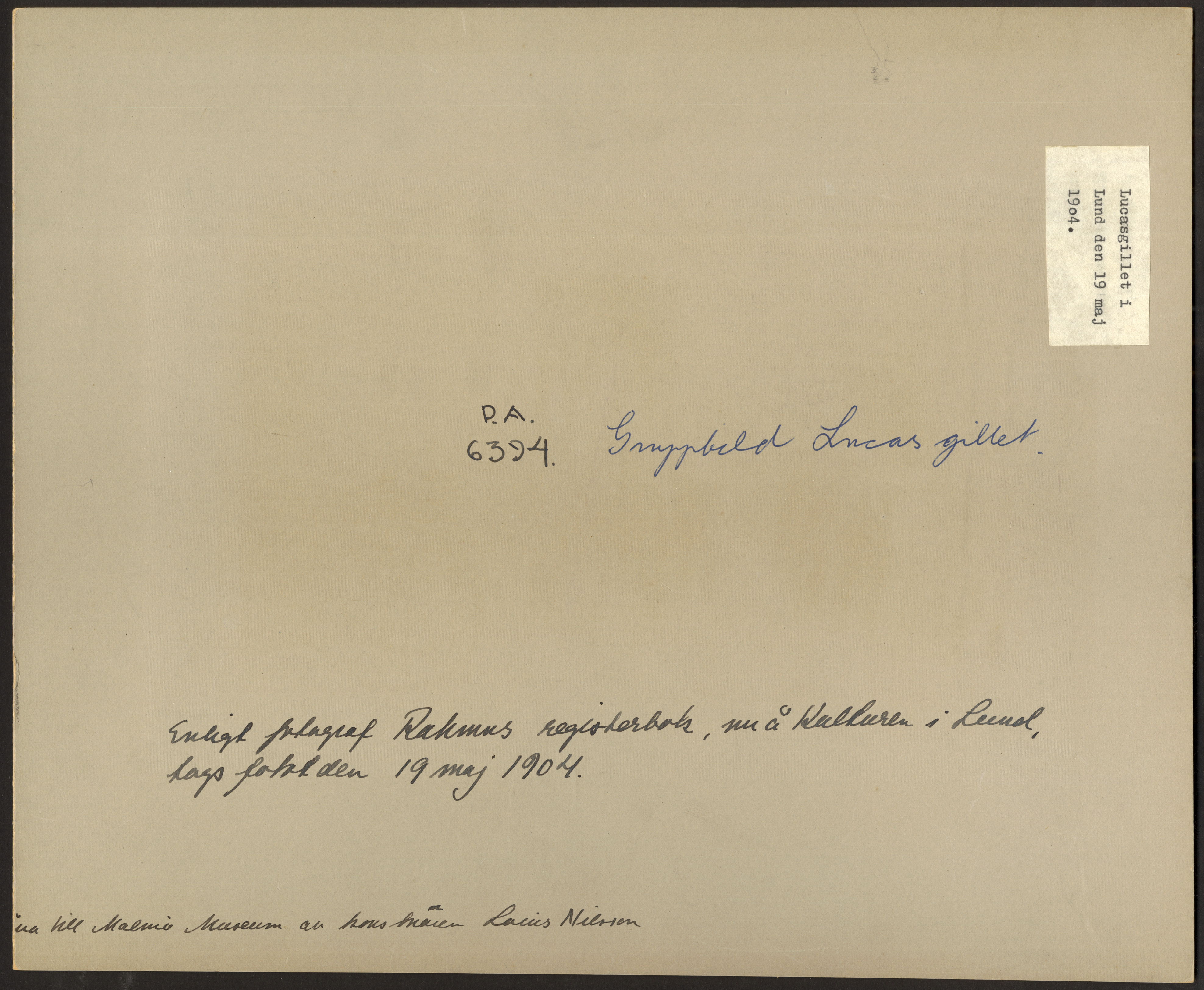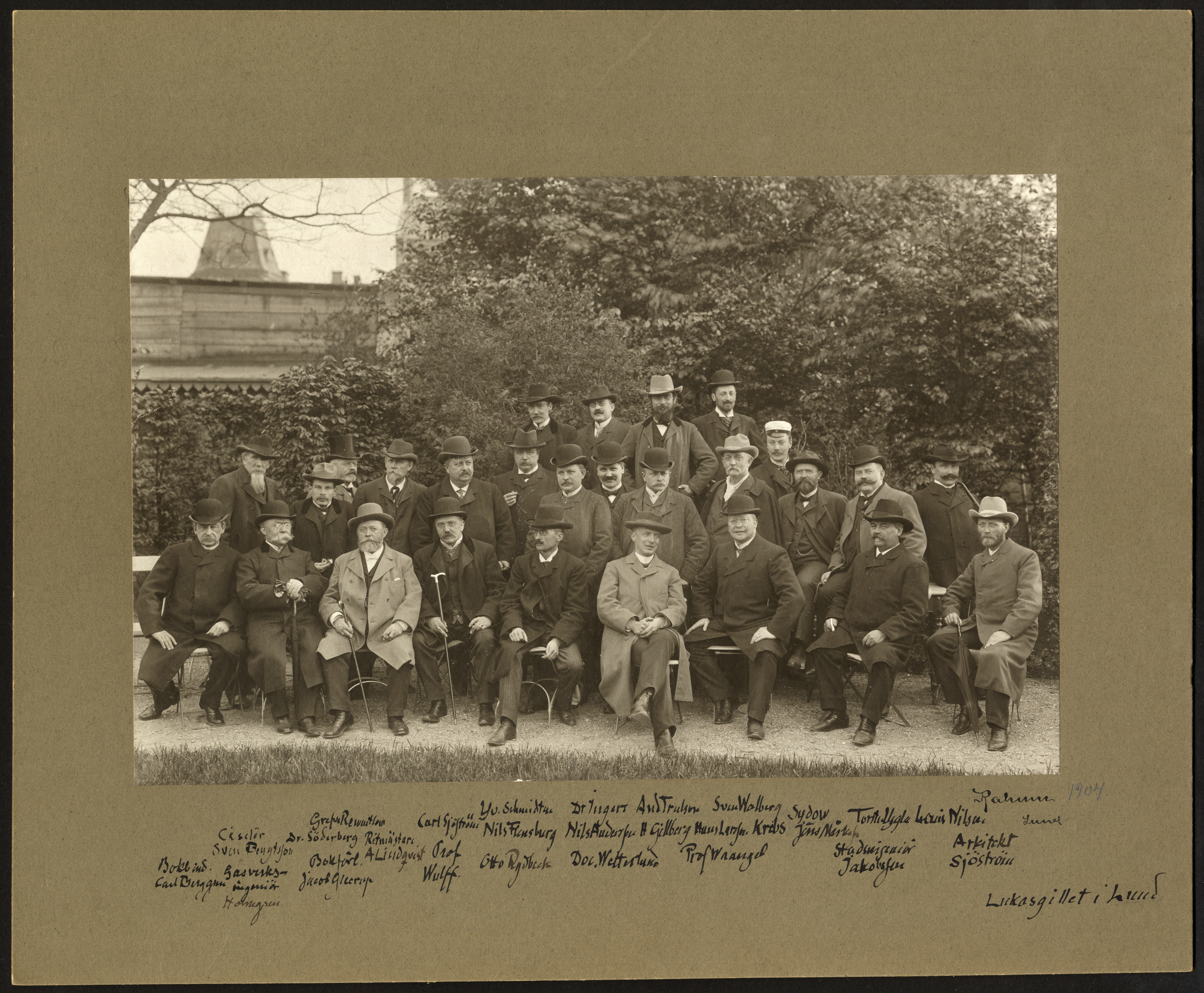 Ordnar och gillen. Lucasgillet, gruppbild. "Enligt fotograf Rahmns registerbok, nu å Kulturen i Lund, togs fotot den 19 maj 1904."