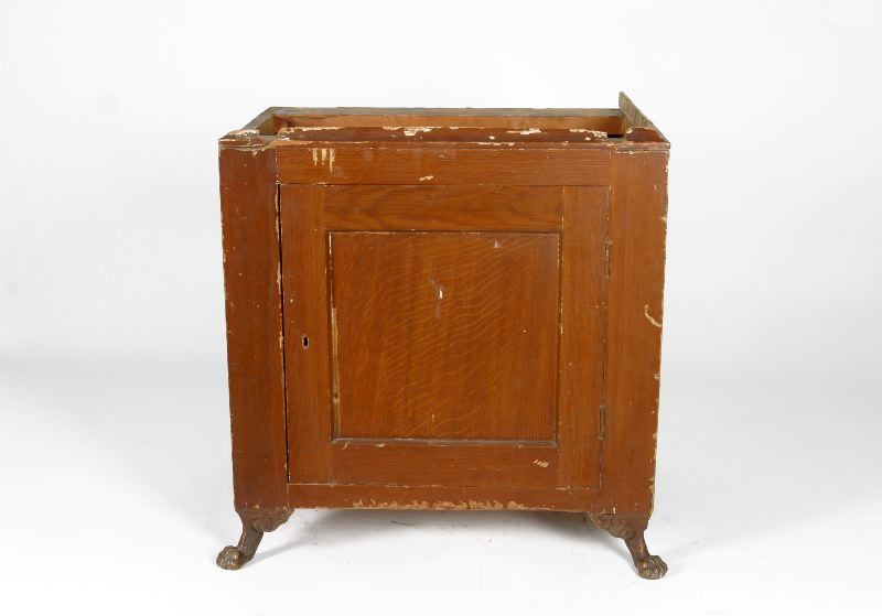 - Kassaskåp i gott skick med underskåp av trä. Brunmålat, gjutjärnsframfötter. Bruksslitage. Har uppenbarligen varit utlånat till myntkabinett, återlämnades därifrån 1992-10-07. Nyckel saknas oktober 1992.