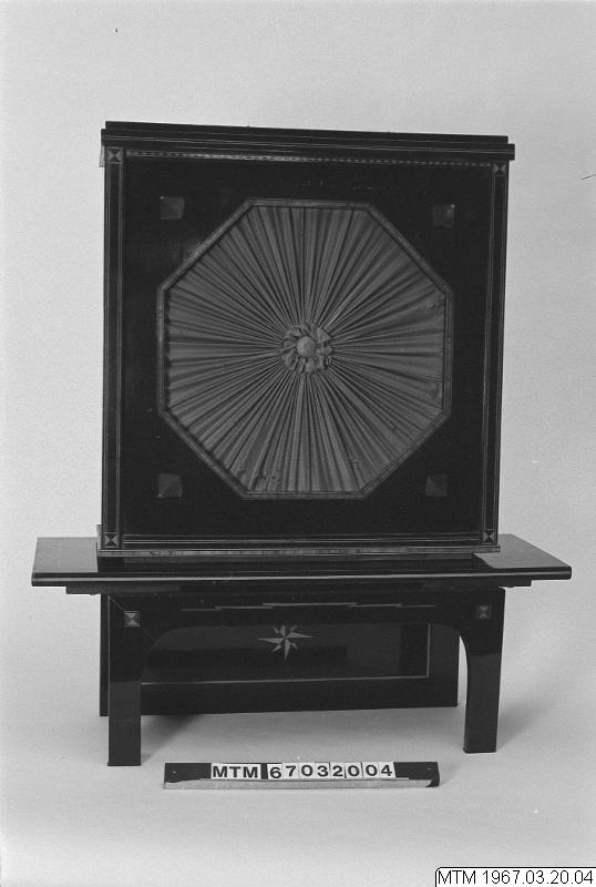 - Radiomottagare, 3-rörs för batteridrift, tillverkad av fil.stud. Ingvar Tynell. Inbyggd i mahognylåda med intarsia. Samt under samma nummer: Förläggningssladd med förgreningskontakt; två tygklädda snodda elledningar; raka ebonitkontakter; förgreningsk.,0 6 A 250 V, K (i rund ring) D.R.G.M. Tillbehör finns på mtmk 26a.