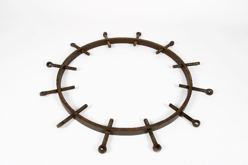 Hjulring av järn med 12 st spännskruvar för tillverkning av vagnshjul. Inre diameter: 700 mm. Yttre diameter inklusive spännskruvar: cirka 930 mm.