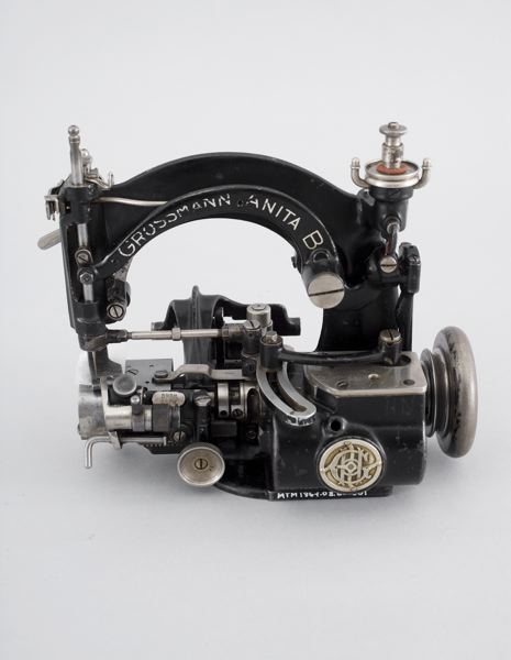 Symaskin, bordsmodell, motordriven (motor saknas). Fabr. Grossman D.R.G.M. Fynd vid husrivning i Östergatan. För stråhattssömnad. Remdriven via transmissioner. Stråhattsfabriken.