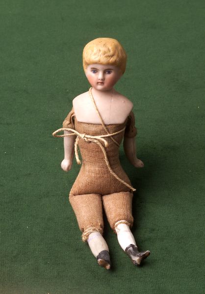 - Docka, huvud, armar och ben av porslin, kroppen stoppad och klädd med vitt bommulstyg, huvudet rosafärgat med vitt hår och blåa ögon, benen vita med svarta kängor, huvudmärkt; m. i Germany/214-810