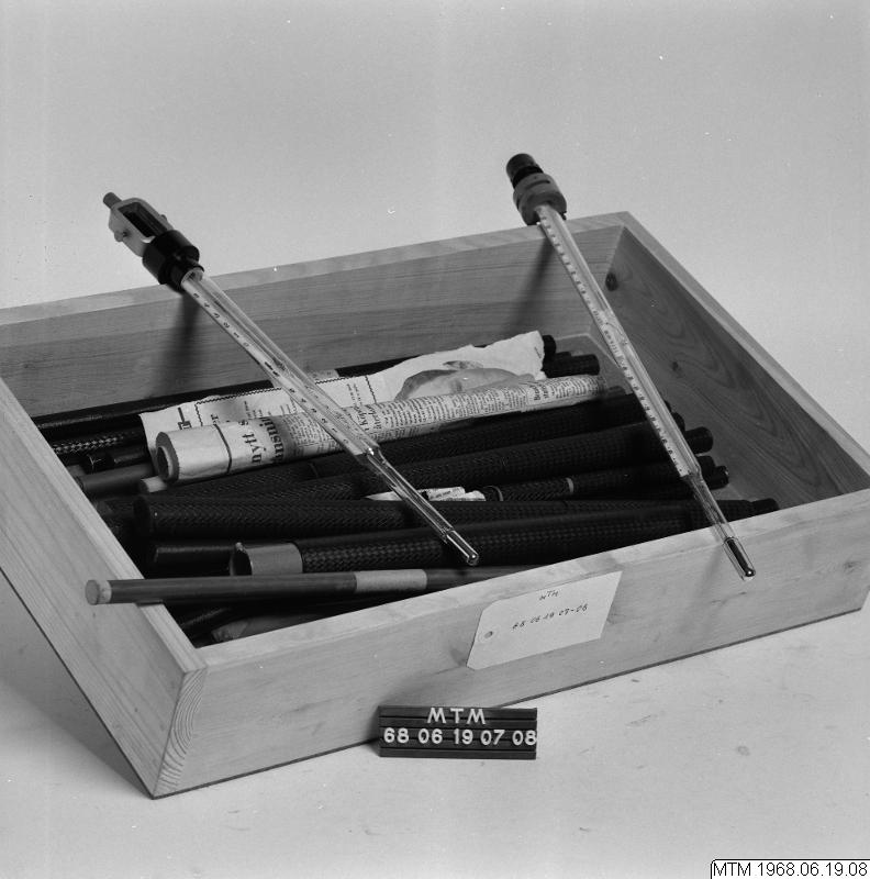 Termometrar, sackarimetrar m m. 61 st. olika. Ej närmare genomgånget. Sammanblandat med MTM 1968.06.19.07.