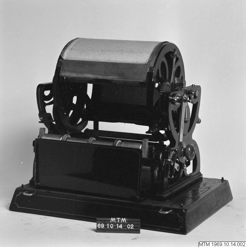 Dupliceringsmaskin med räkneverk, roterande, handdriven, svartlackerad plåthuv.