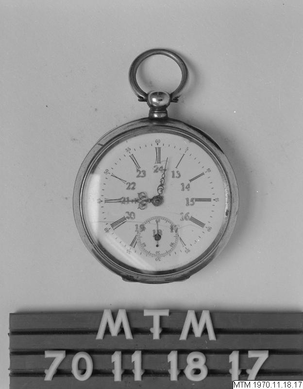 - Fickur, omärkt av schweiziskt fabrikat. Vit emaljurtavla, förgyllda visare och romerska siffror med röd arabisk sifferring innanför. Mässingsboett, eventuellt förgylld. Liten sekundvisare. Glas på båda sidor.