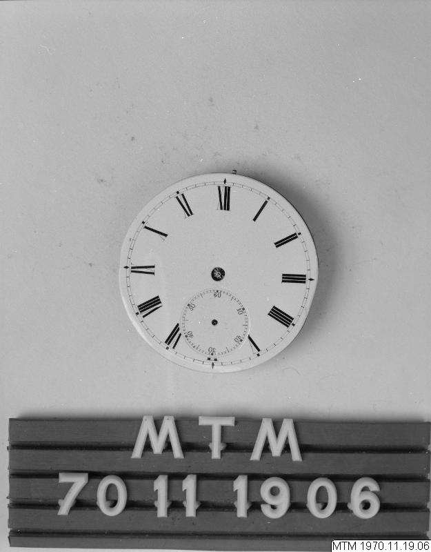 - Urverk till fickur av schweiziskt fabrikat märkt: "Compensations Balance". Med vit emaljerad urtavla och romerska siffror. Liten sekundurtavla. Glas saknas. Ankargång av äldre typ, högglanspolerat med infällda stenar. En tidig typ av schweisisk ankargång.