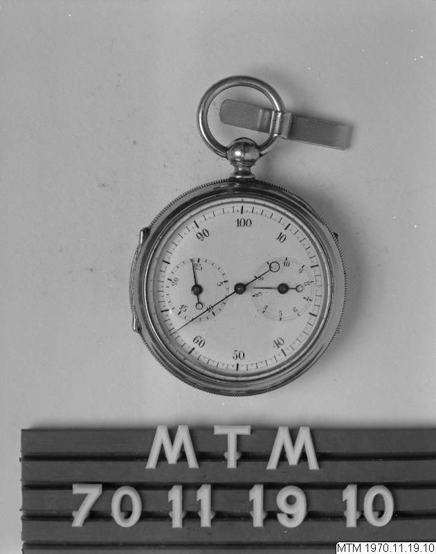 Stoppur, slagräknarprincip. Verket märkt PVP. Blånerad centrumvisare och svarta stålvisare. Två små vita emaljerade urtavlor. Krombett med baksida av glas.