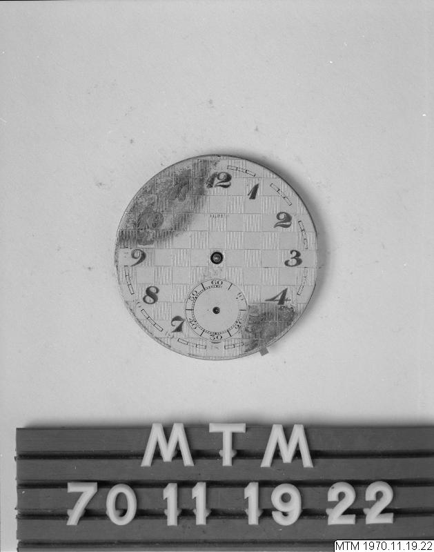 - Urverk, löst, till fickur, savonett. Med sidoställd urtavla i schackrutigt mönstrad gulmetall med pålagda arabiska siffror i gulmetall. Liten sekundtavla, svarta sekundsiffror samt svagt synliga svara siffror för 13-24. Svagt synlig text POLHEM . Märkt: Henry Moser & Co. Verknummer 699244. Ankarverk av mässing. Kronuppdrag, krona och axel saknas.