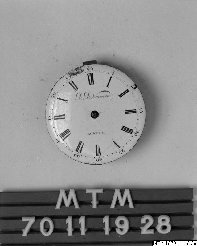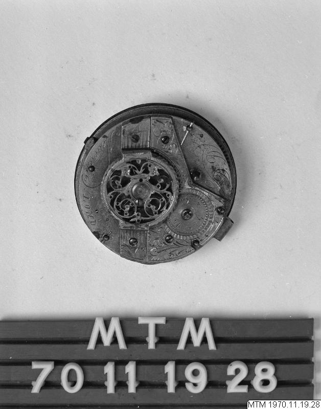 Urverk av mässing med genombruten oroklove till fickur signerat D.D Neveren nr. 542, London.