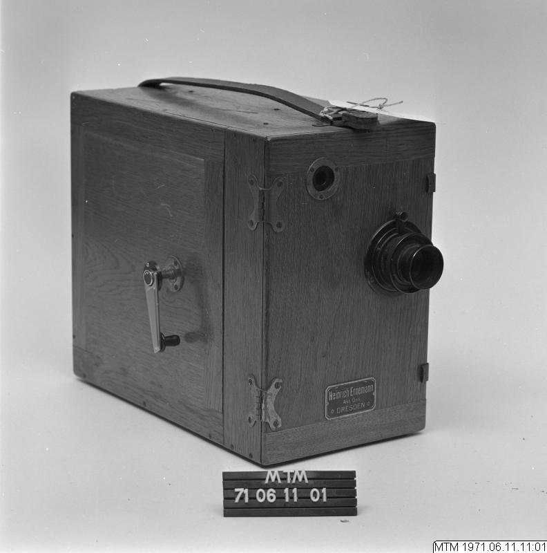 - Filmkamera, för normalfilm, i eklåda 155x240x280 mm, nr:323659. Objektiv märkt: Ernemann Anastigmat Ernon 3,5 Ser C 50 mm No: 64017. Fabrikat: Heinrich Ernemann AG, Dresden. Från omkring 1910. Gåva från Generalkonsul Herbert Dieden, Malmö.