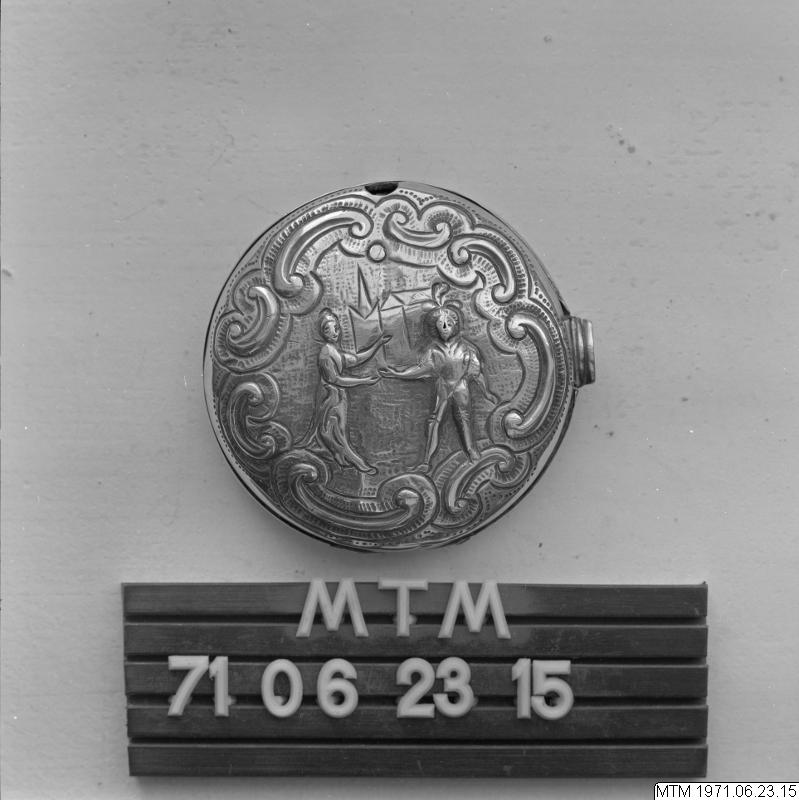 Boett till fickur. Silver, driven, präglad. Bild av man och kvinna som räcker varandra handen. I Bakgrunden silutetten av en kyrka. Bilden utgörande en symbol för äktenskapets ingående.