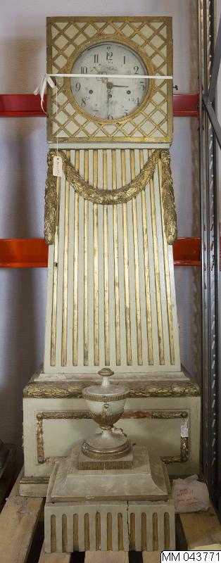 Golvur. Vitlackerat furufodral med gulddekor, i gustaviansk stil. Med tre lod och en pendel.