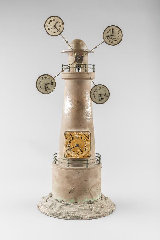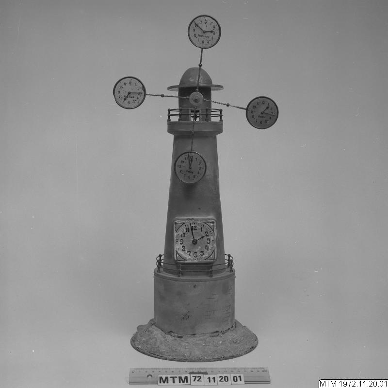 - Bordsur. Pendelur med släphaksgång. Plåthus i form av fyrtorn eller mölla. Fem urtavlor, en för normaltid och ringverk samt en för tiden i Peking, Petersburg, Madrid respektive New York. Uret är använt i Finland, men är tillverkat omkring 1900 av Junghans i Tyskland.