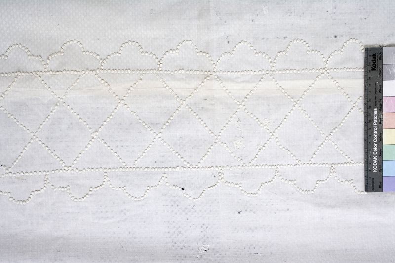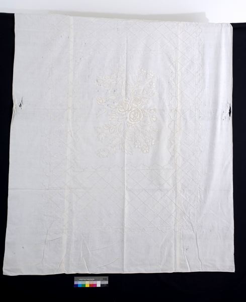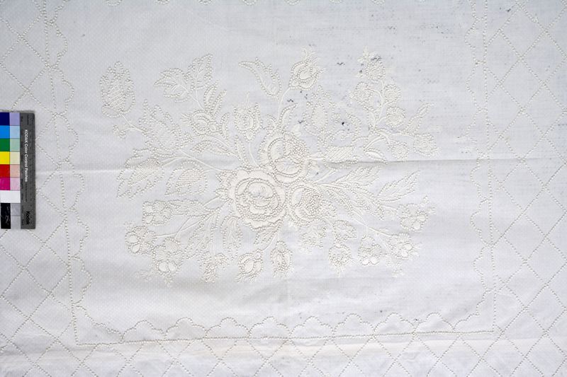 Sängöverkast av tunnt, vitt, mönstervävt bomullstyg, med broderier i knut-, platt-
