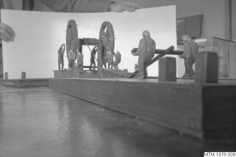 Modell av Frans Suells mudderverk från 1772 med pråm för muddermassorna.
