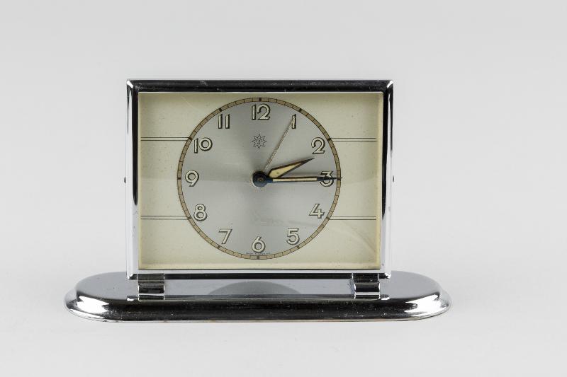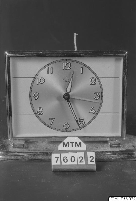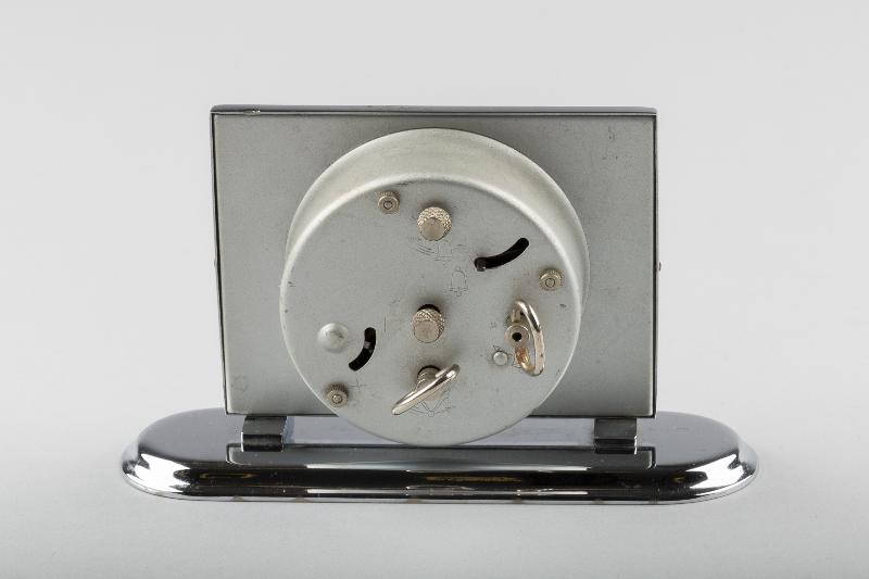 Väckarur med fjäderverk. Förnicklat klockfodral. Etikett på undersidan: Borkings ur, Malmö. Tel 29454.