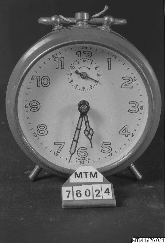 Väckarur med fjäderverk märkt IMPORT. Urfodral av rödlackerad plåt. 1940-tal.