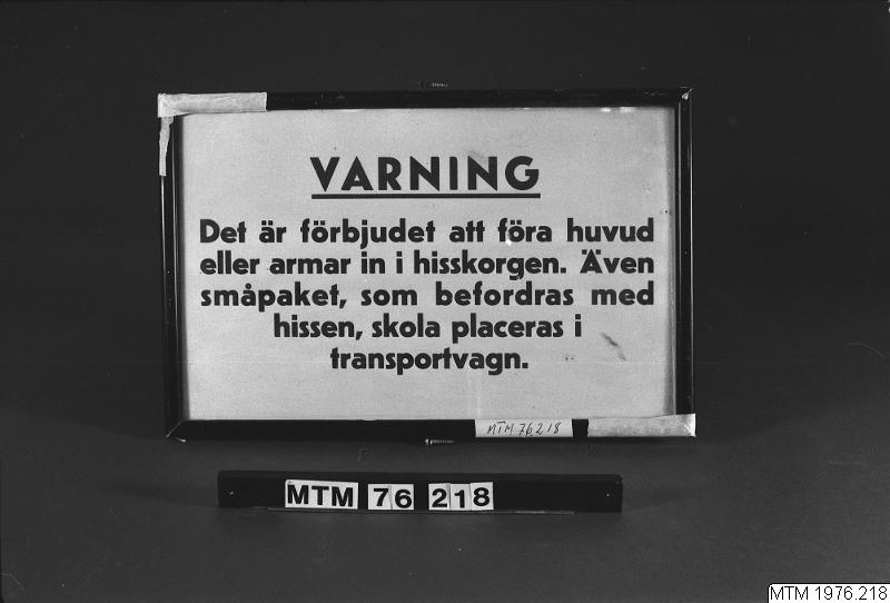 Skylt, glas och ram. text: "VARNING. Det är förbjudet att föra huvud eller armar in i hisskorgen. Även småpaket, som befordras med hissen, skola placeras i transportvagn".