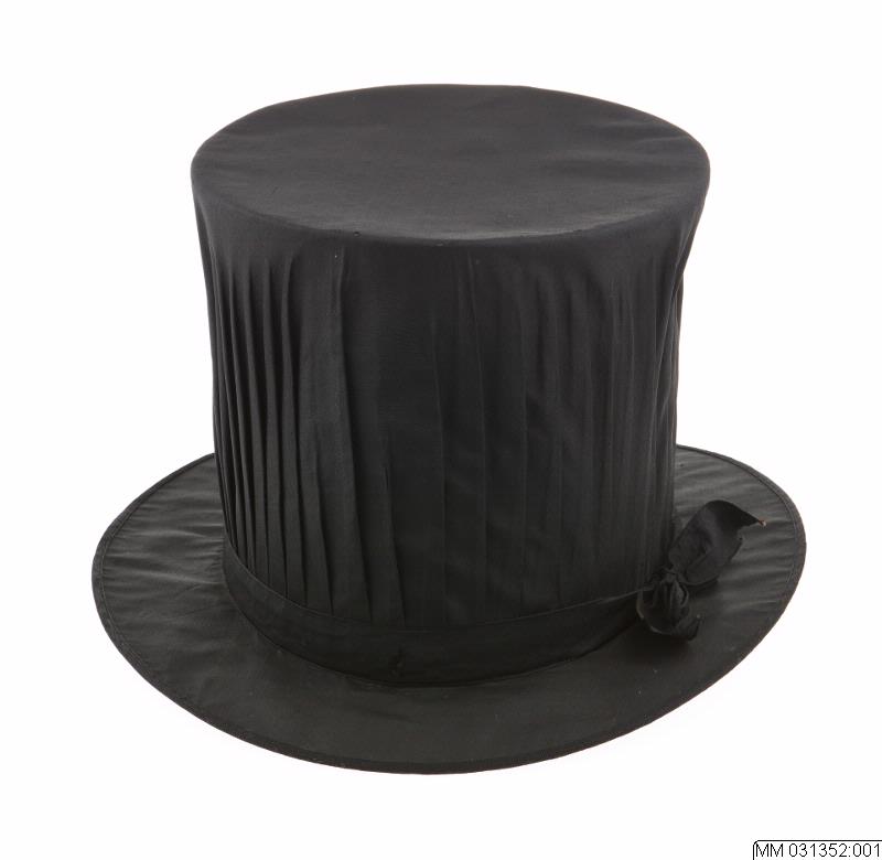 Doktorshatt av svart taftsiden som är veckat runt kullen. Hattband med knuten rosett i vänster sida av svart bomullsband. Kantskoning på brättet av svart ripsband. Bred svettrem av svart konstläder. Foder av mönstrat violett papper. Stomme av papp.